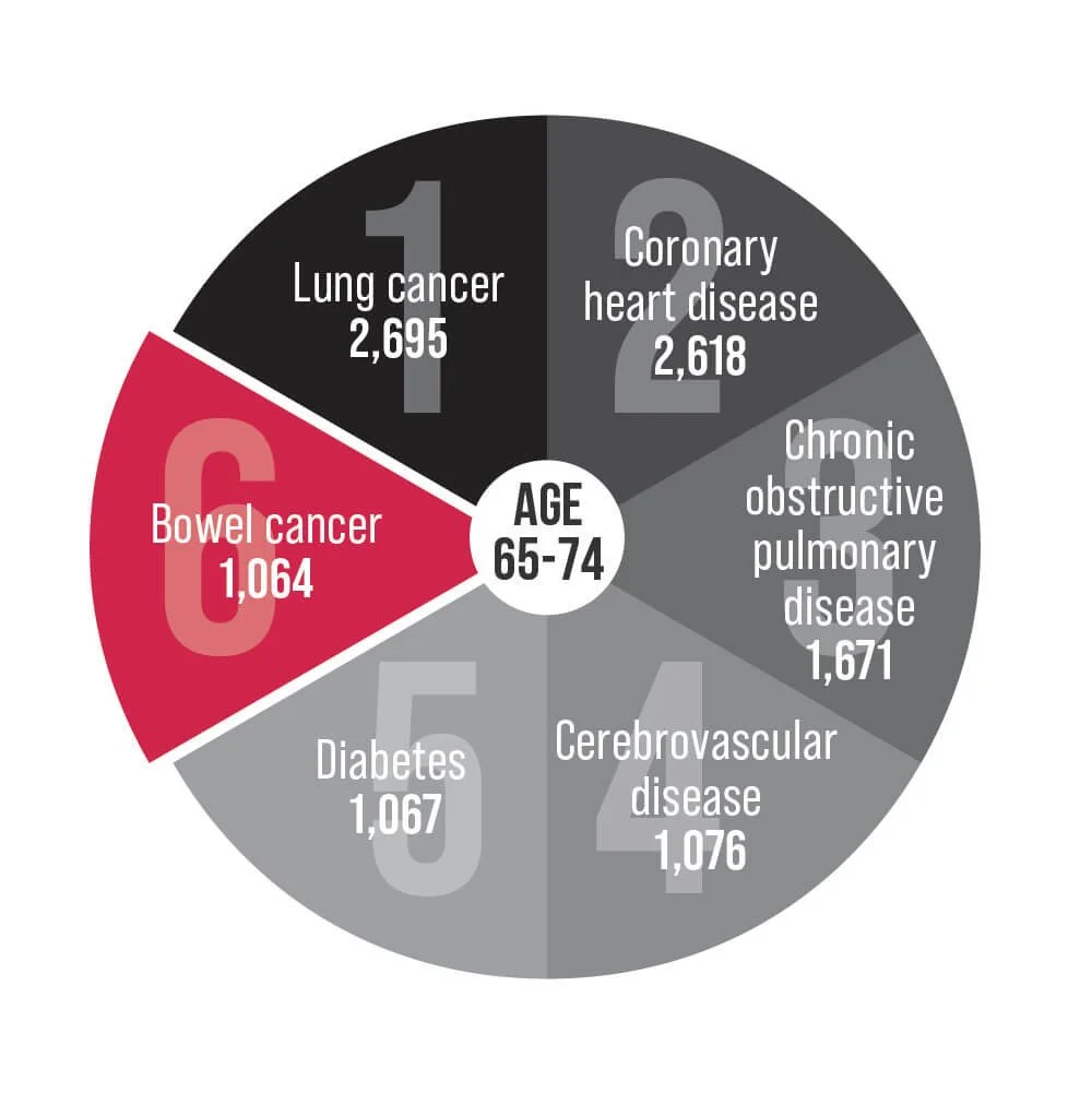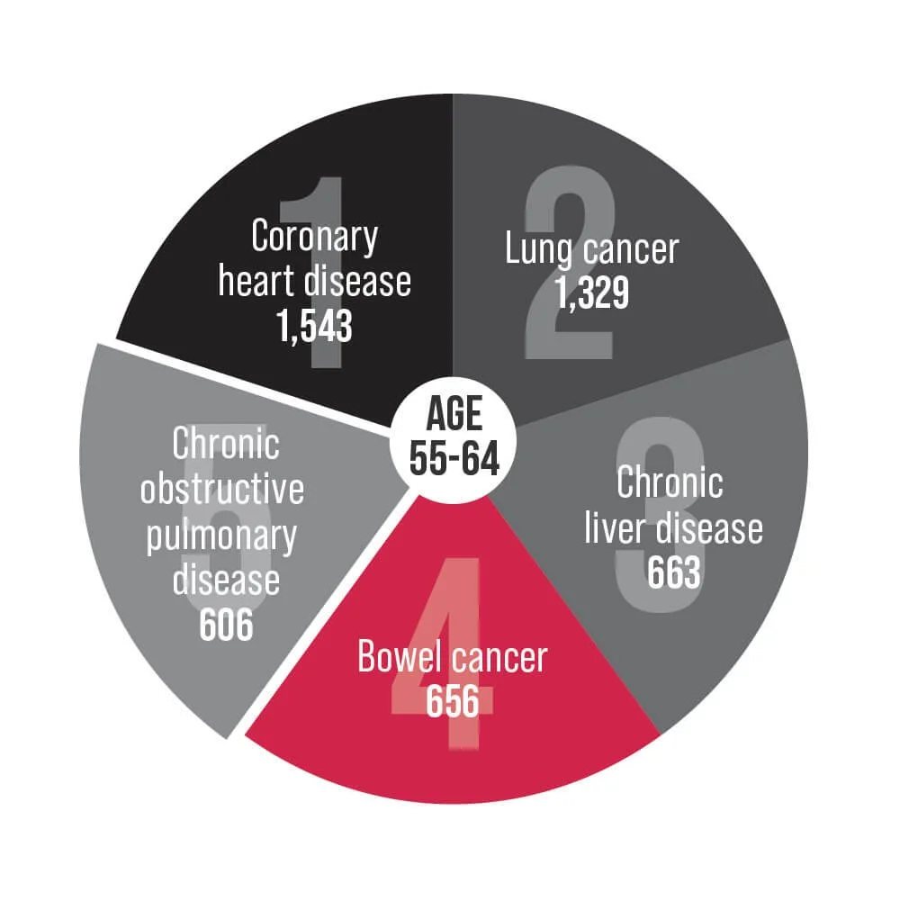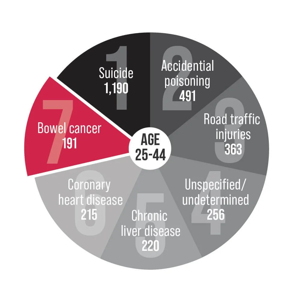 Bowel cancer is now estimated to be the leading cause of cancer death among men aged under 50 and the second leading cause of cancer death in women aged under 50.